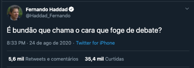 “É bundão que chama o cara que foge do debate?”, questionou Haddad, ao relembrar que, na época das eleições, Bolsonaro não participou dos debates. E aproveitou para atacar sobre o discurso do presidente aos jornalistas em cerimônia no Palácio do Planalto, nesta segunda.
