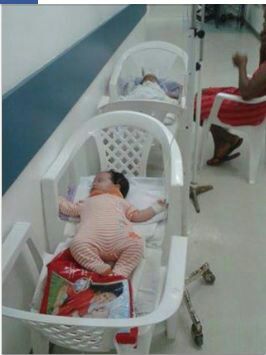 Improvisando, cadeiras de plásticos viram leitos nas laterais dos corredores, enquanto o Brasil vai parar por causa da Copa.