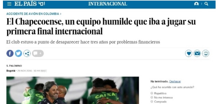 Já o “The Guardian” disse que o Chapecoense está vivendo um “conto de fadas”. O time faria o confronto mais importante do clube na próxima quarta na Colômbia.