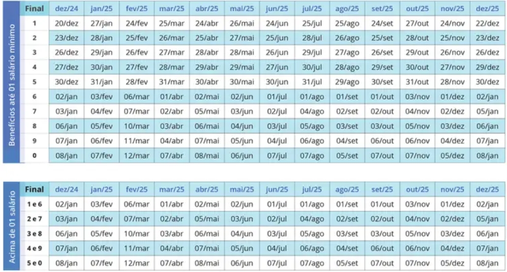 Os 40 milhões de beneficiários do INSS já podem conferir as datas de pagamento das aposentadorias, auxílios e pensões em 2025. O calendário foi divulgado no último dia 18 e mantém a mesma estrutura de anos anteriores, com datas definidas pelo número final do cartão de benefício (desconsiderando o dígito verificador).
