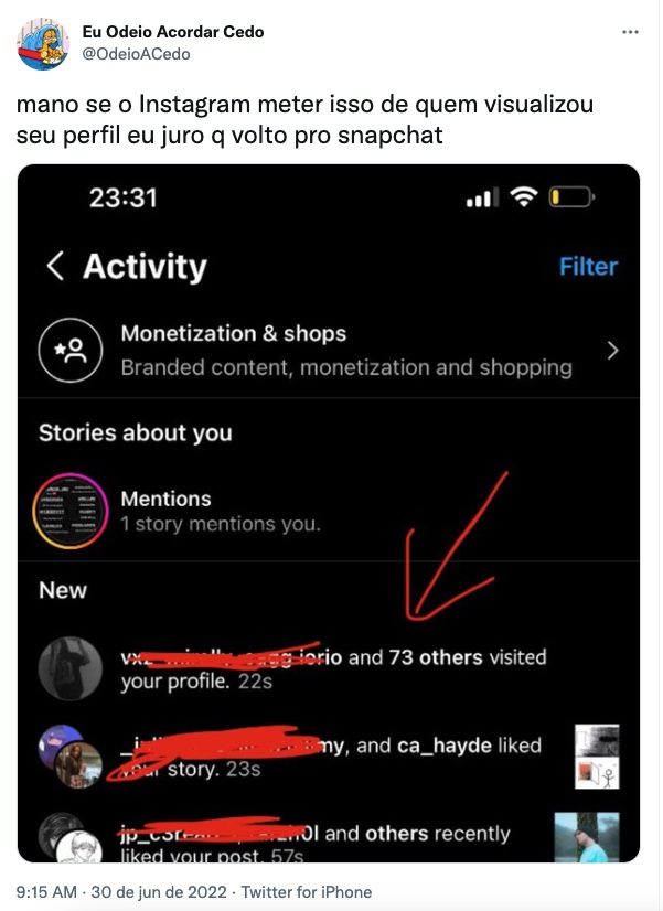 Tudo começou quando uma imagem foi compartilhada no Twitter, que mostra uma tela de uma conta do instagram revelando a quantidade de pessoas que teriam visitado o perfil do usuário. Entretanto, a suposta captura de tela é uma montagem.
