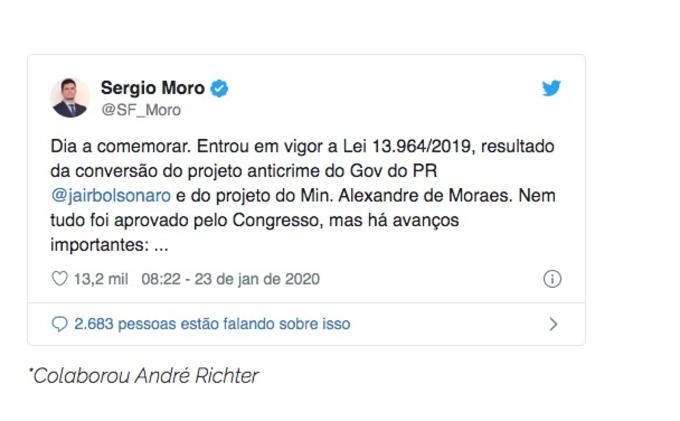 Pelas redes sociais, o ministro da Justiça e Segurança Pública, Sergio Moro, disse que a nova lei tem avanços importantes. O ministro afirmou que nem todas as medidas propostas foram aprovadas pelo Congresso e disse que "em 2020, vamos resgatar o que ficou de fora."