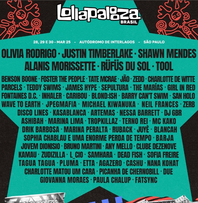 O Lollapalooza Brasil divulgou nesta terça-feira (3), as atrações que estarão no festival em 2025. Na lista destaca-se Olivia Rodrigo, Justin Timberlake, Shawn Mendes, Alanis Morissette e Benson Boone.