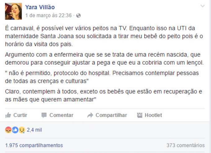 De acordo com o site UOL, Yara foi proibida de continuar amamentando a filha recém-nascida devido ao horário de visita masculina. A mãe indignada escreveu um post sobre o assunto em seu perfil no Facebook e viralizou com vários compartilhamentos.
