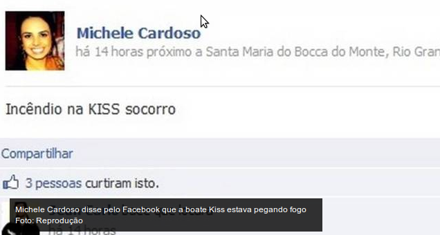A protética Michele Cardoso, que estava na boate Kiss, em Santa Maria, Rio Grande do Sul, na hora do incêndio, usou o Facebook para pedir socorro.
