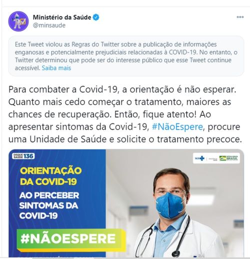 O Ministério da Saúde recebeu um alerta de que houve "informações enganosas e potencialmente prejudiciais relacionadas à COVID-19". A postagem da pasta pede que o tratamento precoce seja solicitado por quem apresentar sintomas da doença, o que destoa de diversas pesquisas científicas sobre a ineficácia de tais medicamentos.