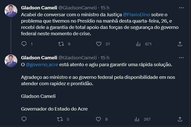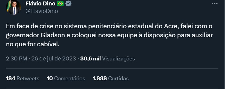 Flávio Dino também usou o Twitter para demonstrar apoio ao governador diante a crise no sistema penitenciário do Estado. "Em face de crise no sistema penitenciário estadual do Acre, falei com o governador Gladson e coloquei nossa equipe à disposição para auxiliar no que for cabível", escreveu ele.