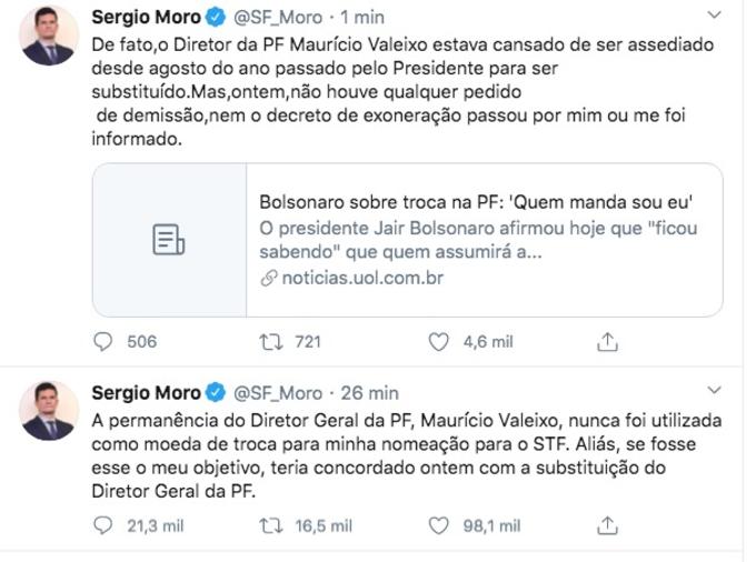 "A permanência do Diretor Geral da PF, Maurício Valeixo, nunca foi utilizada como moeda de troca para minha nomeação para o STF. Aliás, se fosse esse o meu objetivo, teria concordado ontem com a substituição do Diretor Geral da PF", publicou o ex-juiz da Lava-Jato.
