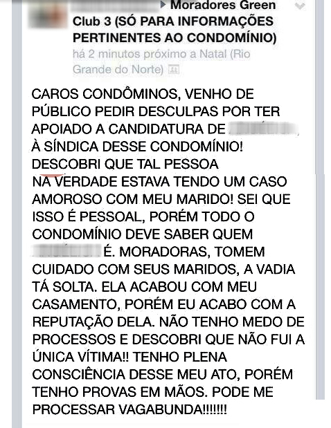 A traída chegou inclusive a pedir votos para que a "melhor amiga" se tornasse síndica. Revoltada ela decidiu contar tudo no grupo do Facebook do condomínio: