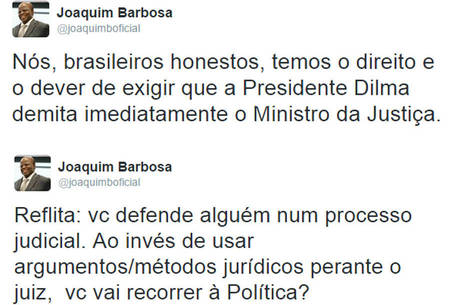 Joaquim Barbosa, ex-ministro do STF (Supremo Tribunal Federal), cobrou em sua página no Twitter, a demissão imediata do ministro da Justiça, José Eduardo Cardozo. O pedido, direcionado à presidente Dilma Rousseff, ocorreu após a divulgação em vários meios de comunicação que Cardozo teria se encontrado com advogados de empreiteiras envolvidas na operação Lava Jato, da PF (Polícia Federal).