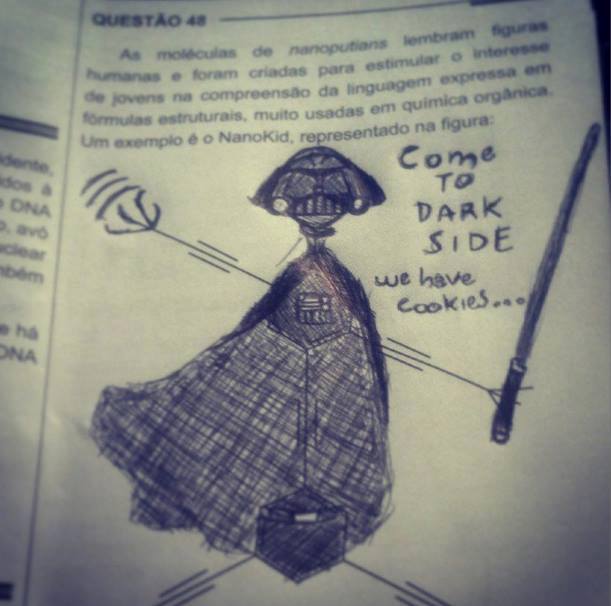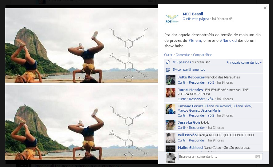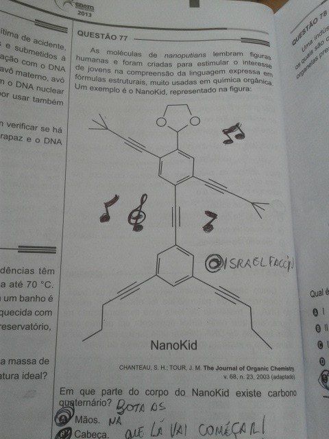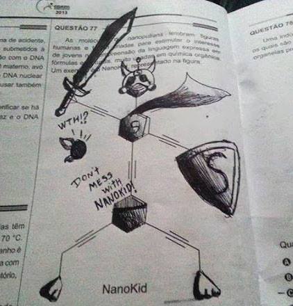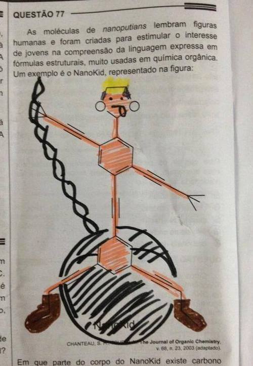 Entre atrasos e contratempos, certamente o que vai marcar o ENEM deste ano é a figura (agora famosa) do NanoKid. Por lembrar figuras humanas, as moléculas de nanoputians se não eram conhecidas agora serão. Veja a seguir algumas obras de arte com a questão: