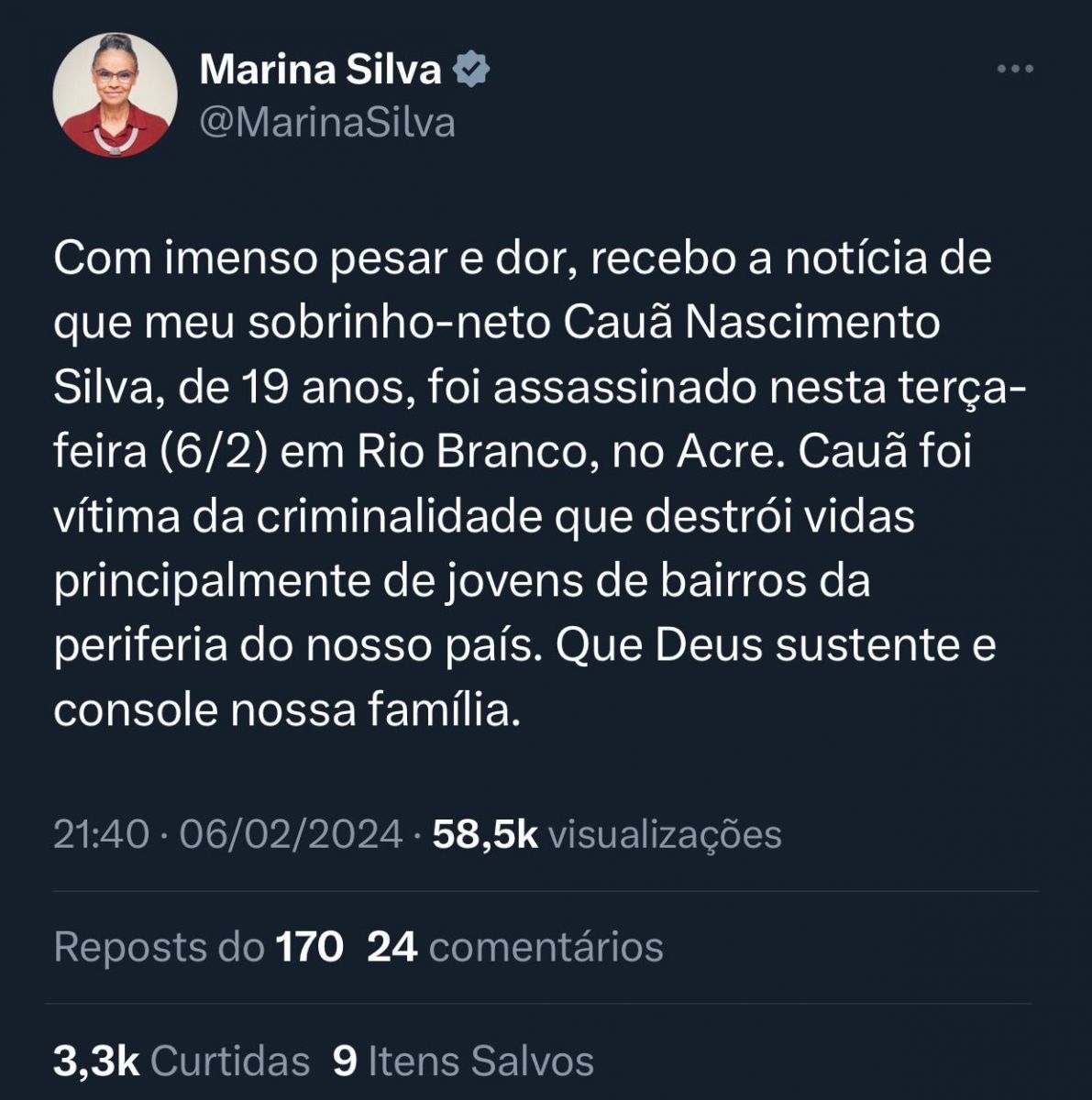 No antigo Twitter, a ministra lamentou. "Com imenso pesar e dor , recebo a notícia de que meu sobrinho-neto Cauã Nascimento Silva, de 19 anos, foi assassinado nesta terça-feira (6/2) em Rio Branco no Acre. Cauã foi vítima da criminalidade que destrói vidas principalmente de jovens de bairros da periferia do nosso país. Que Deus sustente e console nossa família", escreveu.