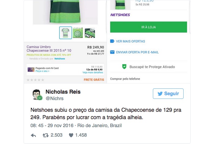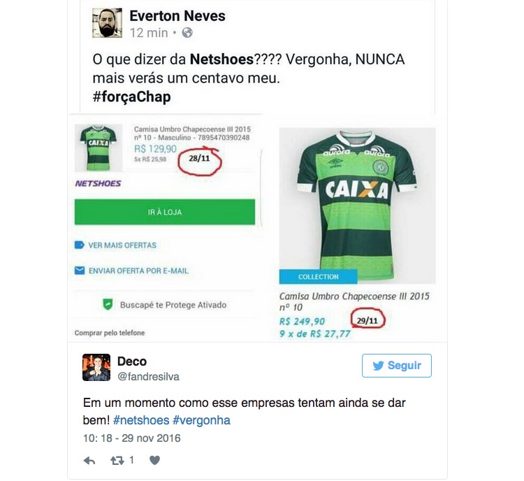Internautas ficaram irritados com o aumento do preço da camisa do Chapecoense que passou de R$ 129,90 para R$ 249,90 nesta terça-feira (29) coincidentemente no mesmo dia em que jogadores do time morreram em um acidente de avião na Colômbia.