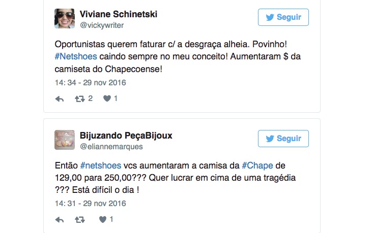 De acordo com o "Uol", ao perceberem a mudança no valor na loja virtual da Netshoes, vários internautas criticaram a loja acusando-a de se aproveitar da tragédia. “Parabéns por lucrar com a tragédia alheia”, escreveu uma pessoa no Twitter.