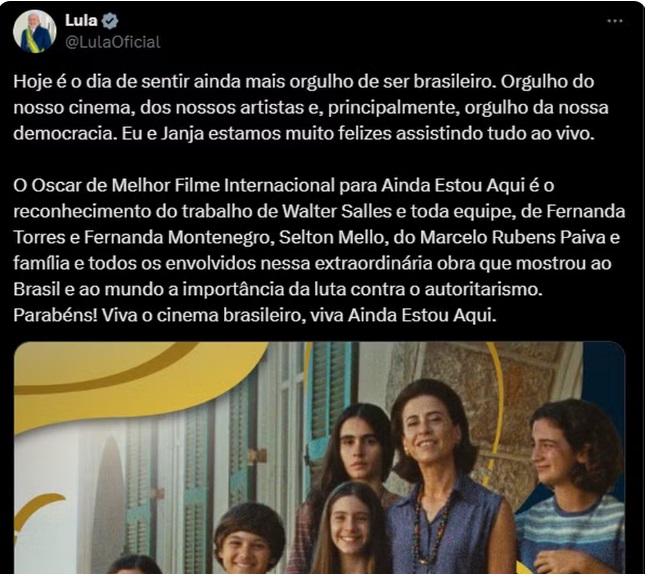 Lula escreveu nas redes sociais que é dia de "sentir ainda mais orgulho de ser brasileiro". "Orgulho do nosso cinema, dos nossos artistas e, principalmente, orgulho da nossa democracia. Eu e Janja estamos muito felizes assistindo tudo ao vivo", afirmou o presidente.