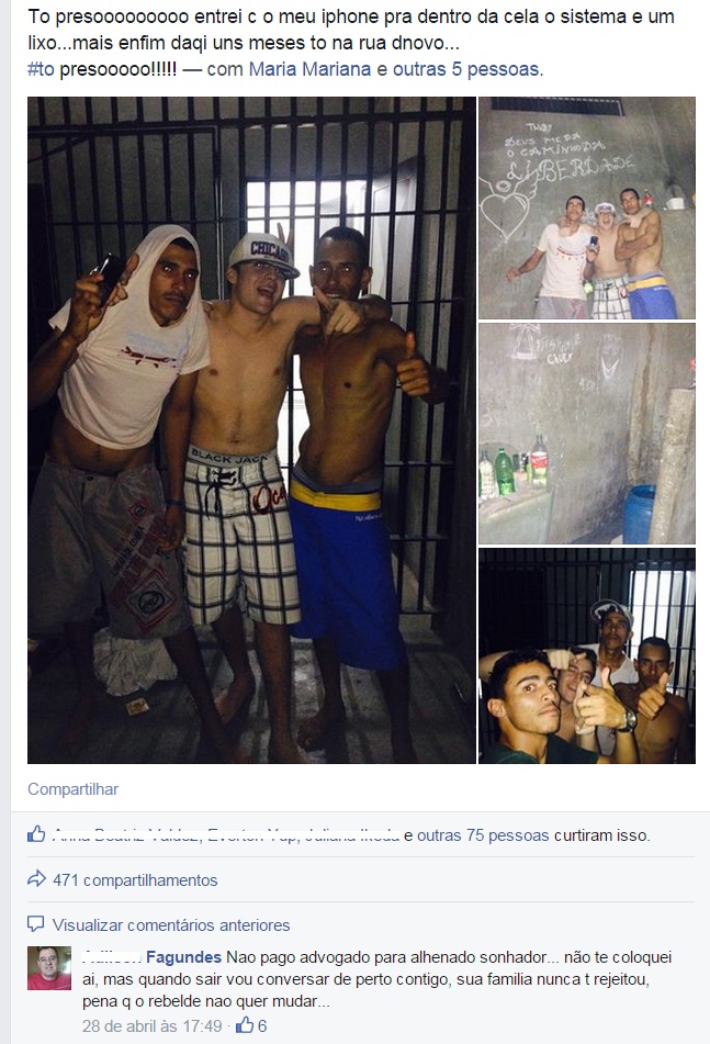 O rapaz, que em sua página da web informa que é universitário, publicou várias 'selfies' com os novos amigos atrás das grades, e ainda zombou da fiscalização policial, que não confiscou seu smartphone. “To presooooooooo. Entrei com o meu iphone pra dentro da cela. O sistema é um lixo, mas enfim, daqui a uns meses tô na rua de novo”, escreveu o suspeito.