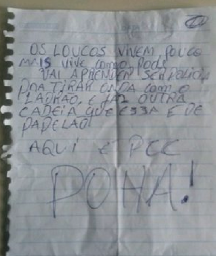 “Os loucos vivem pouco mais vive como pode. Vai aprender ser polícia para tirar onda com o ladrão, e faz outra cadeia que essa é de papelão. Aqui é PPC, POHA!”, diz a mensagem.