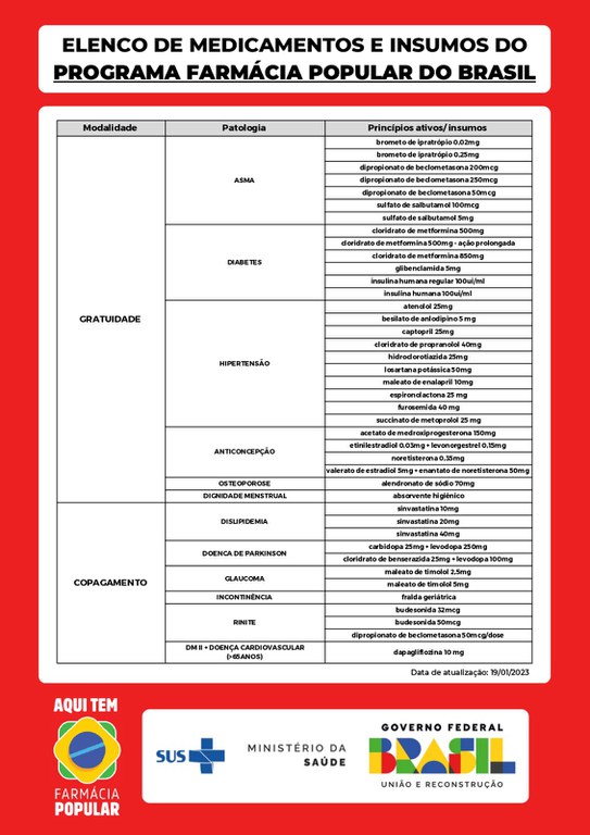 Os brasileiros que têm diabetes, asma, hipertensão e osteoporose podem ter acesso a medicamentos gratuitos para essas doenças. O benefício faz parte do programa Farmácia Popular, do Governo Federal, que oferece, também, anticoncepcional e absorventes de graça, além de medicamentos com custo reduzido para tratamento de rinite, doença de Parkinson, glaucoma, incontinência (fraldas geriátricas), diabetes associadas à doença cardiovascular e dislipidemia (gordura no sangue). Nesses casos, o Ministério da Saúde paga parte do valor dos medicamentos (até 90% do preço de referência tabelado) e o cidadão arca com o restante, de acordo com o valor praticado pela farmácia. Ao todo, o programa contempla 40 fármacos.
