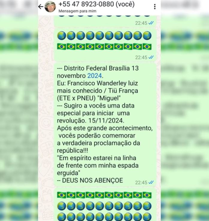 A polícia teve acesso aos prints de mensagens de Francisco Wanderley Luiz, onde o homem afirma que plantou bombas nas casas de políticos e do jornalista William Bonner e desafia a PF a encontrar os artefatos antes que eles sejam detonados.