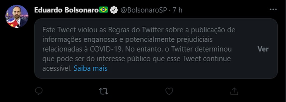 O deputado federal Eduardo Bolsonaro fez um post sobre a eficácia da vacina e o Twitter colocou um aviso de "publicação de informações enganosas e potencialmente prejudiciais relacionadas à Covid-19". No texto o deputado também fala sobre "lockdown" e distanciamento social.