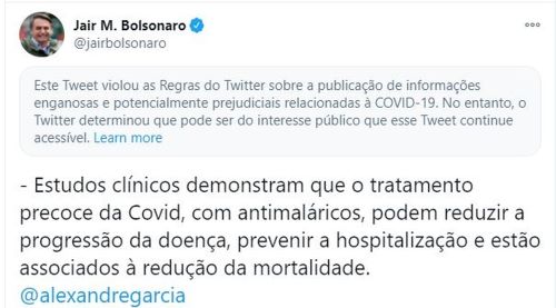 O tuíte recebeu uma restrição, no entanto, continua disponível no site. Na postagem, Bolsonaro disse que "Estudos clínicos demonstram que o tratamento precoce da Covid, com antimaláricos, podem reduzir a progressão da doença, prevenir a hospitalização e estão associados à redução da mortalidade".