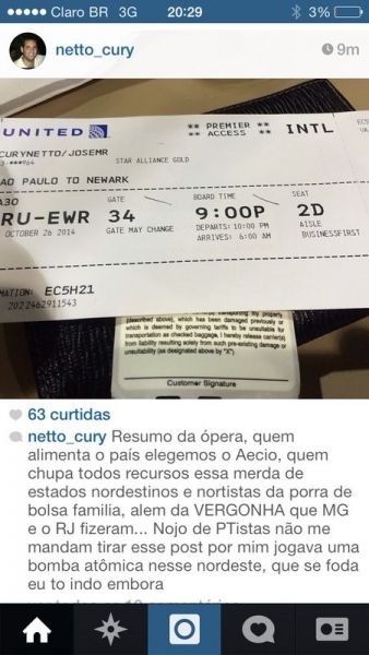 Um usuário do Instagram com o nome de Netto Cury fez comentário que gerou críticas na rede social neste domingo (26), dia de segundo turno das eleições. Ao postar uma foto de uma passagem de avião para a cidade de Newarkn, no estado de Nova Jérsei, nos Estados Unidos, ele disse que deixaria o Brasil com o argumento de que os nordestinos não sabem votar. “Resumo da ópera, quem alimenta o país elegemos (sic) o Aécio, quem chupa todos recursos essa merda de estados nordestinos e nortistas da p**** de bolsa família, além da vergonha que MG e RJ fizeram... Nojo de PTistas não me mandam (sic) tirar esse post por mim jogava uma bomba atômica nesse nordeste que se f*** eu to indo embora”, postou.