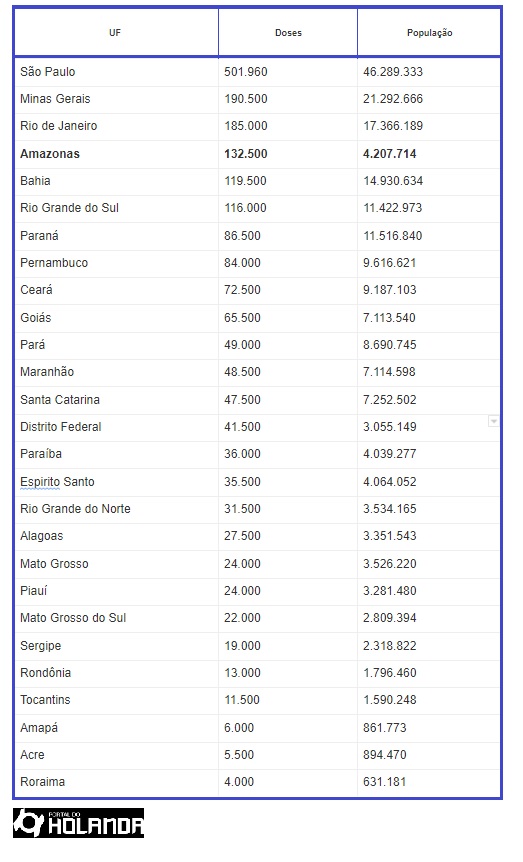 Com a chegada dos 2 milhões de doses da vacina Oxford/AstraZeneca, provenientes do Instituto Serum, na Índia, e a checagem, rotulação e liberação feita pela Fundação Oswaldo Cruz, foi divulgado neste sábado quantas doses cada estado brasileiro irá receber.