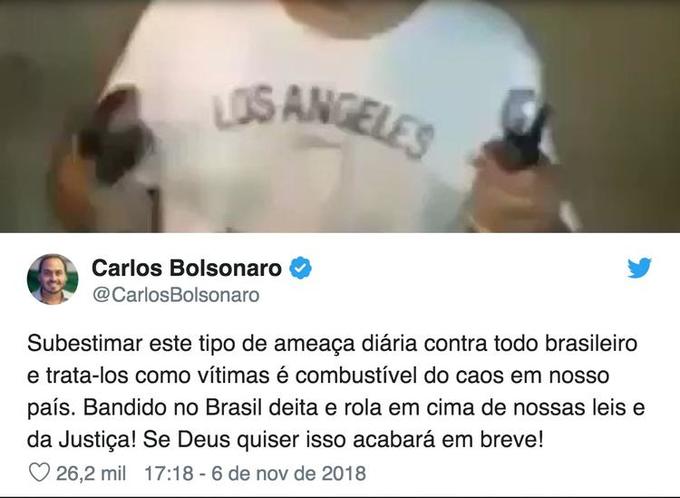 No segundo vídeo, que foi divulgado também pelo vereador Carlos Bolsonaro, o suspeito aparece segurando duas pistolas, com o rosto a mostra e dizendo: “Bolsonaro, tu vai entrar na bala”.