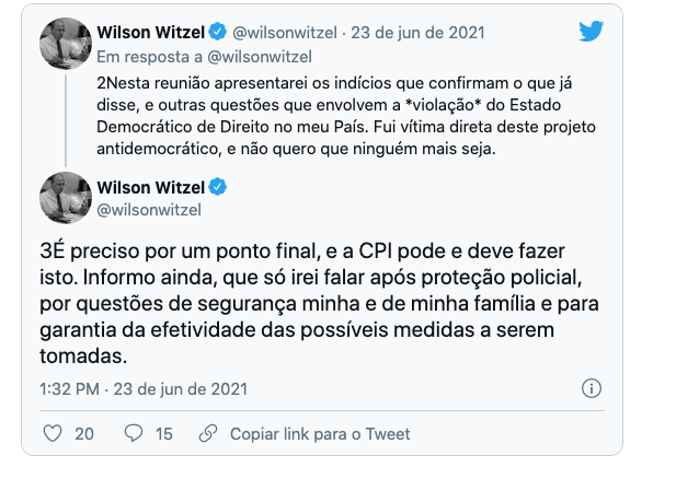 O ex-governador do Rio de Janeiro, Wilson Witzel pediu proteção policial como condição para prestar novo depoimento na CPI da Covid, de forma secreta, apenas para os senadores da Comissão.