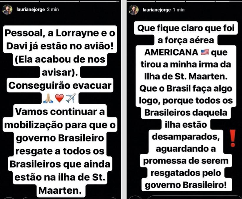 "Pessoal, a Lorrayne e o Davi já estão no avião, ela acabou de nos avisar. Conseguiram evacuar, vamos continuar a mobilização para que o governo brasileiro resgate a todos os brasileiros que ainda estão na ilha de St. Maarten. Que fique claro que foi a força aérea AMERICANA que tirou minha irmã da Ilha de St. Maarten. Que o Brasil faça algo logo, porque todos os brasileiros daquela ilha estão desamparados, aguardando a promessa de serem resgatados pelo governo brasileiro!".