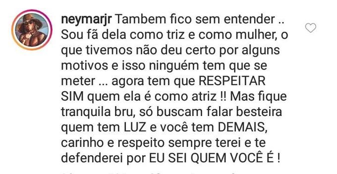 Após diversas polêmicas envolvendo o ex-casal 'Brumar', Neymar defendeu Bruna Marquezine, após a atriz sofrer duras críticas do apresentador Léo Dias, na última semana. Em uma publicação onde mostrava um tweet da atriz desabafando sobre o caso, o jogador comentou: ‘'Também fico sem entender.. Sou fã dela como atriz e como mulher, o que tivemos não deu certo por alguns motivos e isso ninguém tem que se meter… agora tem que RESPEITAR SIM quem ela é como atriz!! Mas fique tranquila bru, só buscam falar besteiras quem tem LUZ e você tem DEMAIS, carinho e respeito sempre terei e te defenderei por EU SEI QUEM VOCÊ É!