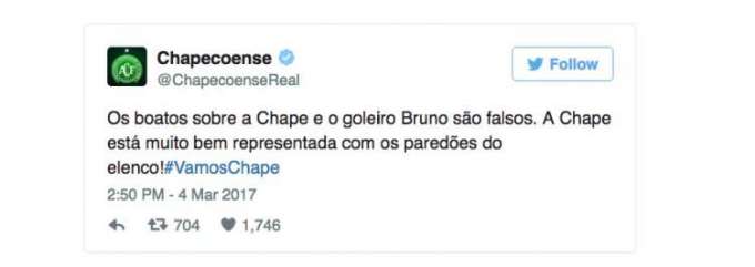 "Os boatos sobre a Chape e o goleiro Bruno são falsos. A Chape está muito bem representada com os paredões do elenco! #VamosChape" anunciou a diretoria no perfil oficial do clube. A declaração causou alívio nos torcedores do time.