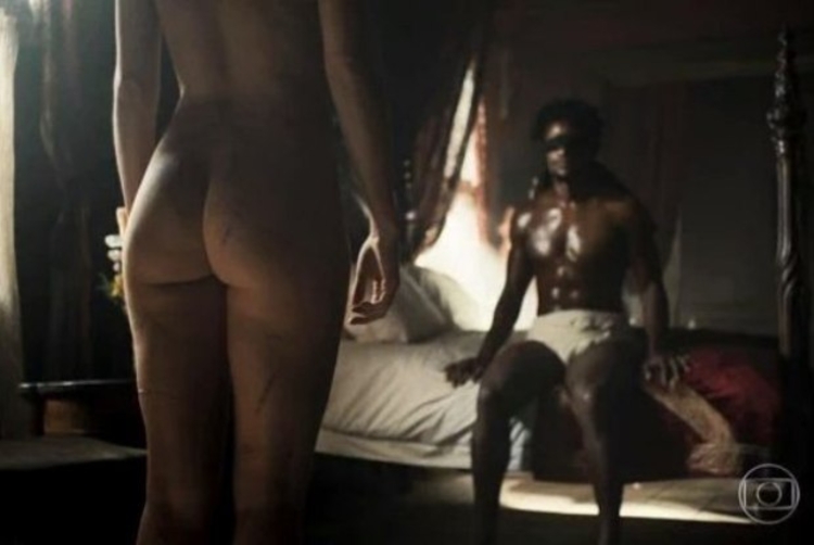 A atriz deixou o bumbum à mostra em uma cena de sexo entre a personagem Dionísia e seu escravo interpretado pelo ator David Junior.