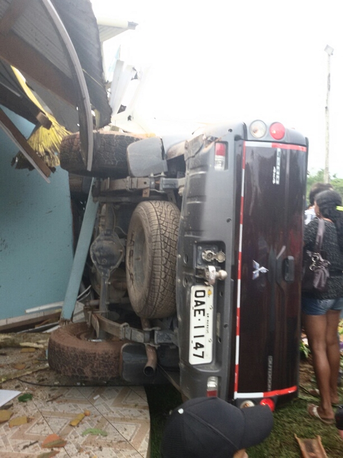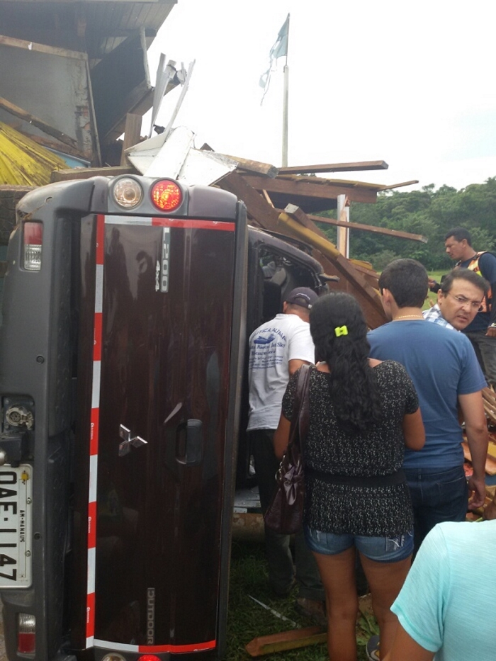 Caminhonete capota na AM-070 e derruba fachada e telhado de comércio
