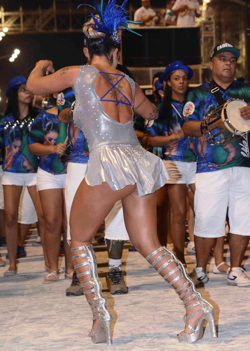 A madrinha de bateria da agremiação desfilará pelo terceiro ano consecutivo na escola, e apesar de não ter usado de nudez no seu look, a peça acabou marcando muito por ser muito justa, e deixou toda a anatomia da moça aparente. Veja as fotos do ensaio: