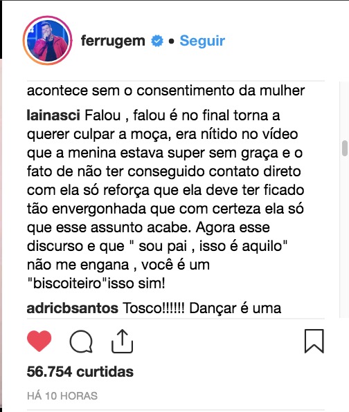 O cantor Ferrugem resolveu se pronunciar após repercussão negativa que ocorreu em um show no fim de semana. Na ocasião, um dançarino surpreendeu uma fã que subiu ao palco com uma dança simulando sexo.