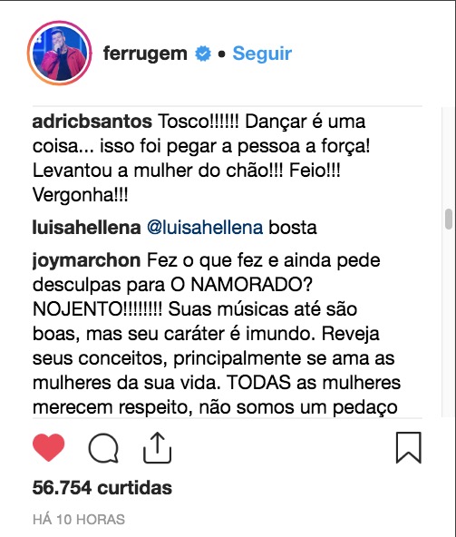 Na madrugada desta segunda (24), o cantor disse que o músico se excedeu e pede desculpas a quem se sentiu ofendido. Ferrugem diz ainda que a fã não se sentiu ofendida, apesar de não ter conseguido falar com ela após o episódio.