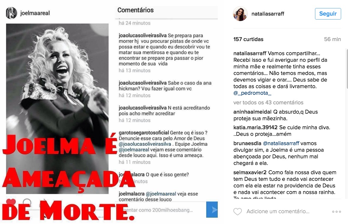 "Vamos compartilhar... Recebi isso e fui averiguar no perfil da minha mãe e realmente tinha esses comentários... Não temos medos, mas devemos vigiar e orar.... Deus sabe de todas as coisas e dará livramento”, escreveu Natalia mostrando prints das ameaças.