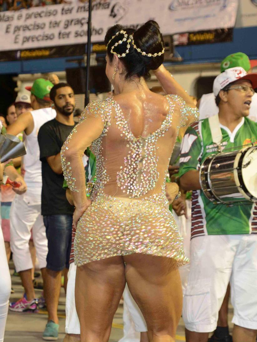 Gracyanne Barbosa foi "traída" pelo seu vestido durante o ensaio da X-9, na noite do sábado (7), e acabou deixando o bumbum à mostra. Para não mostrar os seios, no entanto, a morena usou adesivos colados nos mamilos.