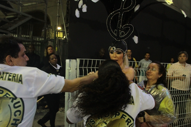 Depois, no meio do desfile, a loira começou a tirar a fantasia para ficar completamente nua. Como a nudez explícita faz a escola perder pontos, os integrantes tomaram um susto ao avistarem a situação e correram para arrancar a moça da Avenida. Um integrante chegou a ser mais agressivo e a puxou pelo braço e a jogou no chão. "Tem que ter respeito ao próximo! Bateram em mim! Me jogaram no asfalto", gritou a loira.