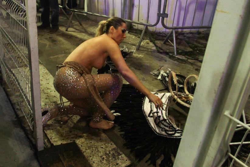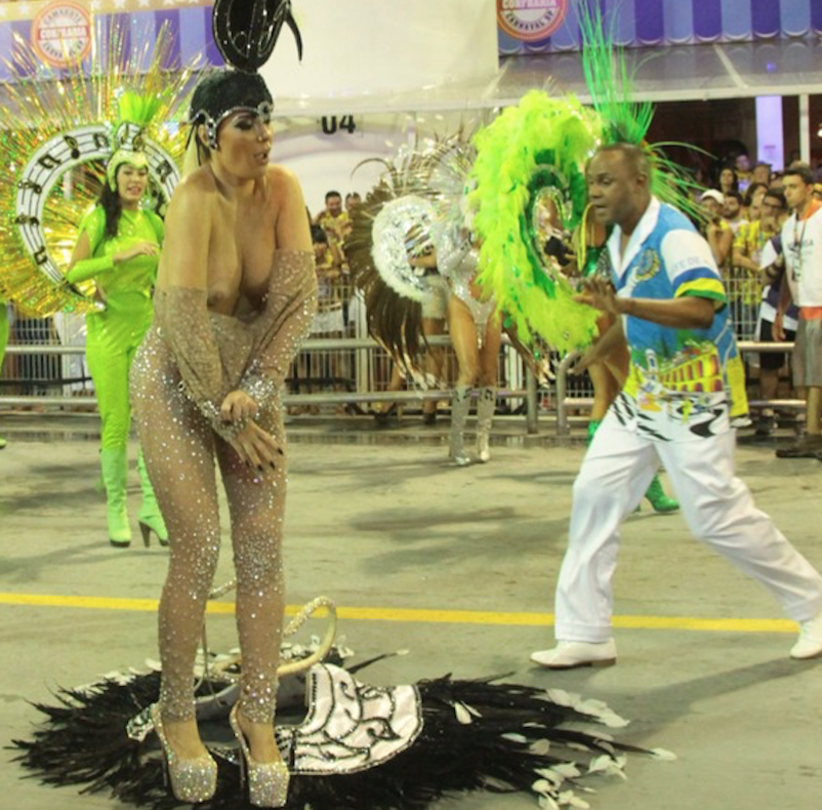 Na noite do sábado, 6, a loira chegou na concentração usando apenas dois adesivos nos mamilos e um tapa-sexo que fazia menção ao impeachment da presidente Dilma Rousseff, na sua virilha. Da sua fantasia que havia combinado com a escola, ela usava apenas o adereço na cabeça.