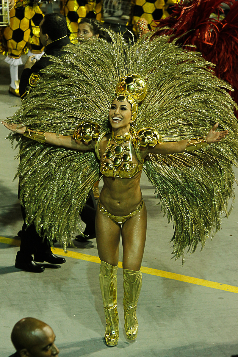 Sabrina Sato mostrou que se empenhou ainda mais para o Carnaval de 2014, principalmente no quesito boa forma. No desfile da Gaviões da Fiel, a apresentadora apareceu sarada em uma fantasia dourada que representa a Bola de Ouro, exibindo até gominhos no abdômen trincado como Madrinha de Bateria da agremiação, durante o desfile deste sábado.