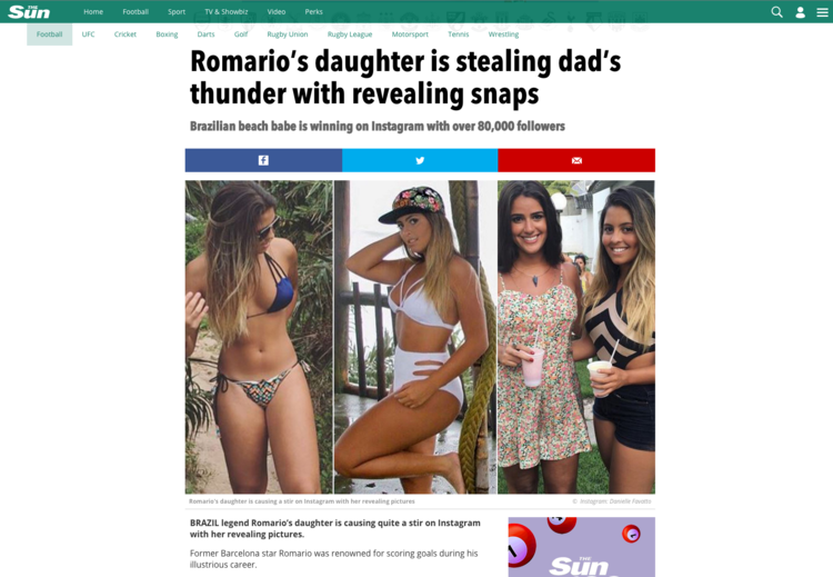O jornal menciona o fato de Romário ter sido o centro das atenções durante sua carreira e eleito o melhor jogador do mundo em 1994, com mais de 1 mil gols, mas que agora que rouba a cena é a filha do atual senador. A jovem tem 84 mil seguidores em sua conta no Instagram, que abastece sempre com fotos de biquíni.