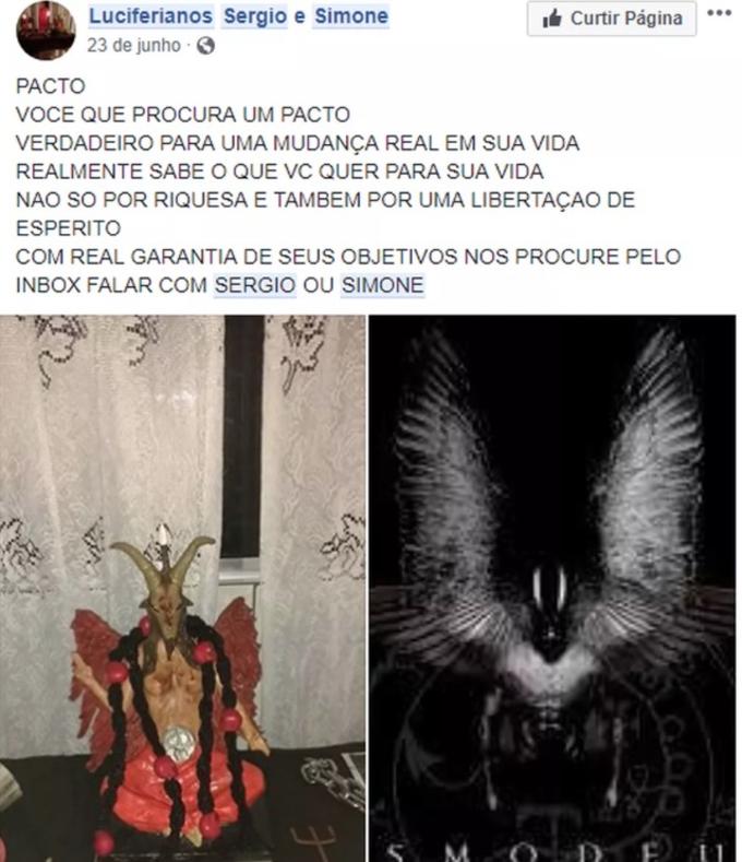 Durante as investigações, a polícia encontrou vários perfis dos suspeitos no Facebook, onde eles afirmam trabalhar com pacto com Lúcifer e ofertam libertação espiritual e prosperidade. Na página eles aparecem com caveiras, pentagramas, capuz preto e estátuas de Satanás, além de altares.