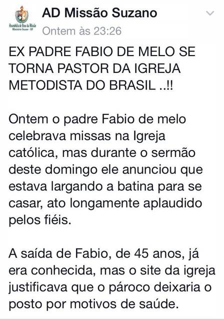 Vem circulando um post que informa a saída do padre da Igreja Católica, por ter se apaixonado por uma mulher. Por isso, segundo a "notícia", ele teria escolhido ser pastor da Igreja Metodista, que permitiria seu casamento com a amada.