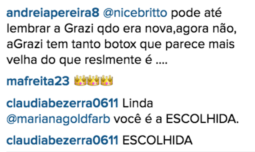 Já outros defenderam que todas as namoradas de Cauã são bonitas, e que a “próxima” do rapaz provavelmente será parecida com as anteriores. Uma outra internauta foi mais dura na crítica e disse que Mariana pode até lembrar Grazi quando a atriz era nova, mas que hoje em dia ela estaria com “tanto botox que parece mais velha do que realmente é”.