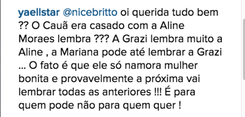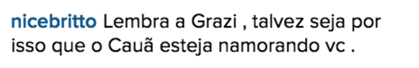 Mas os internautas não esquecem que há pouco tempo, Cauã era casadíssimo com Grazi Massafera. E nos comentários da rede social da gata, já surgiram comparações com a ex-mulher do galã. Uma seguidora chegou a afirmar que ela lembra Grazi, e que por isso o Cauã deve namorar com ela.