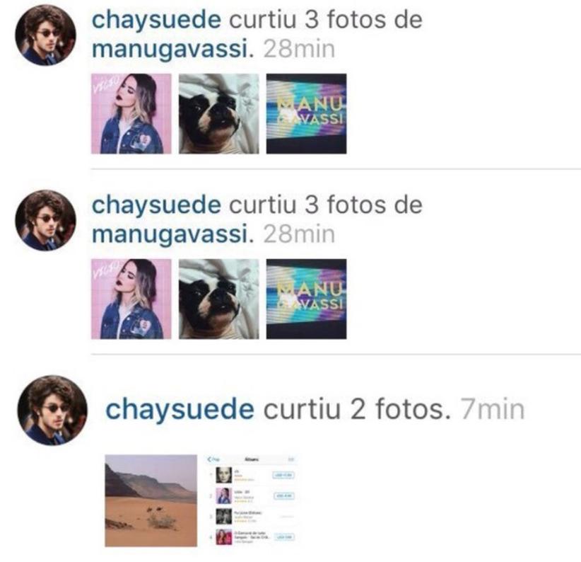 “Chay curtiu”, comemorou uma internauta. “Chay curtindo as fotos de Manu! To morta”, comentou outra. "Chay stalkeando a Manu no Instagram, só sei rir. Gavassied é gavassied né migos”, disse outra.