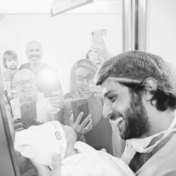 Os dois ainda não mostraram o rostinho da criança, que nasceu de "surpresa" alguns dias antes da data prevista para o parto.