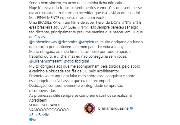 Bruna Marquezine empolgou os fãs ao mostrar o momento em que foi convidada para participar do filme “Blue Beetle” (Besouro Azul), pelo próprio diretor do longa-metragem, Angel Manuel Soto.